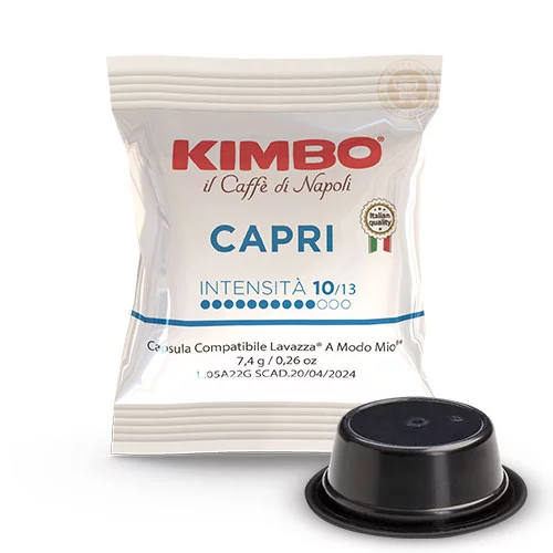 Kimbo Capri in Capsule Compatibili Lavazza A Modo Mio è una miscela di caffè avvolgente ed esclusivo come l’isola di Capri. Un caffè dalla tostatura medio scura e con un gusto profondo e intenso con aromi delicati.